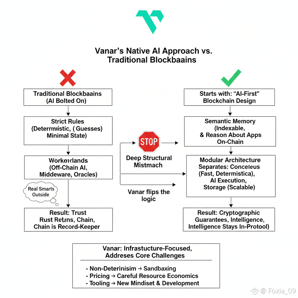Vanar flips that logic.They start at the root: not“how do we stick AI onto a blockchain?” but“what does a blockchain need to look like if AI is baked in from the start?”It’s a subtle shift,but it matters.AI stops being a tacked on feature and becomes part of the foundation. That alone puts Vanar in a different league from most AIcrypto efforts.