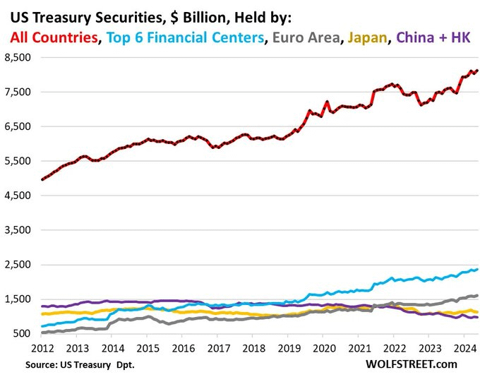 Иностранные инвесторы все еще держат ~$8.2T в казначейских облигациях США (~33% в обращении).