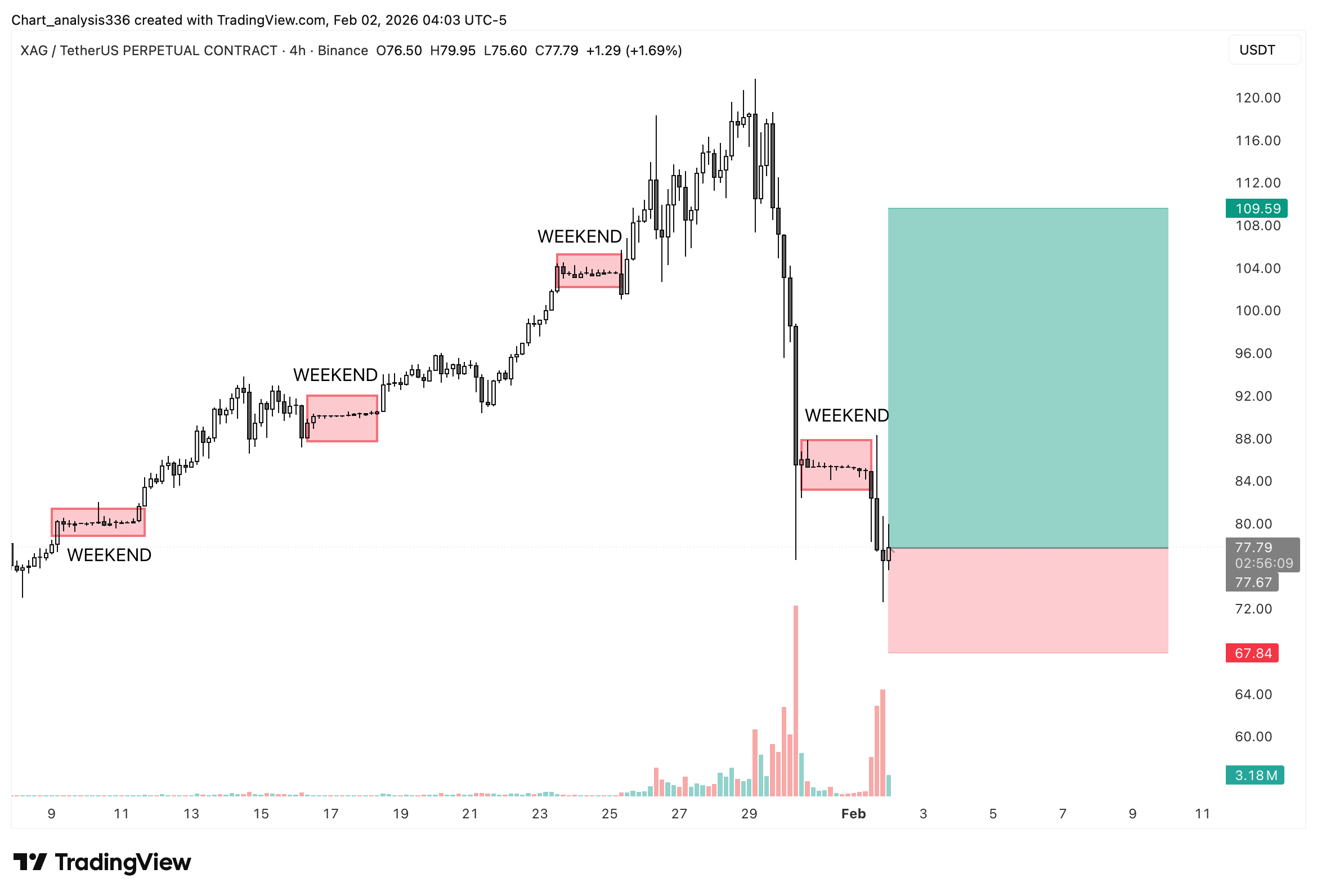 Резкое падение XAG (Серебро) не произошло случайно, оно следовало очень ясному поведенческому паттерну, который уже был виден на графике. На протяжении восходящего тренда цена неоднократно останавливалась и консолидировалась в выходные, как отмечено на графике. Эти узкие диапазоны выходных служили ликвидными пулами, где кредитное плечо медленно накапливалось, в то время как волатильность оставалась подавленной. Как только рынок вернулся к сессиям с высокой ликвидностью, цена резко расширилась. На этот раз, однако, вместо продолжения расширение произошло вниз, поймав поздних покупателей и трейдеров на прорыв совершенно врасплох.