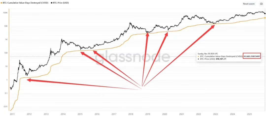 • 基于 CVDD 指标(毁坏天数累积价值)。这是一个十多年来从未失手的逃顶/抄底指标。它代表了那些持币数年的“老钱”被逼到认输离场的底线。