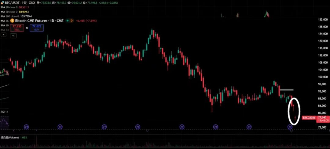 比特币在周末累计10%的下跌,导致今日开盘后又形成了一个更大的CME缺口。虽然这一缺口并不显眼,但仅在短期内,想要反弹到 $93,000去补掉那个期货缺口,显然已经非常困难了。至于周末形成的这个新缺口,倒是有希望通过反弹补掉,不过缺口这类技术形态,虽然绝大部分最终都会被补掉,但具体何时填补,确实没有人能准确预判。不过上方的期货缺口我认为必然会被填补,毕竟比特币的长期趋势显然是向上的,哪怕是在下一个牛市周期去补也无妨。