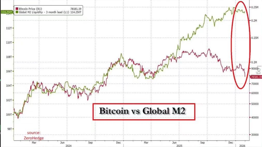 过去几个月,一个危险的信号被市场忽视了:自去年 10 月 10 日以来,比特币与全球 M2、黄金及美股的走势出现了明显的脱钩。