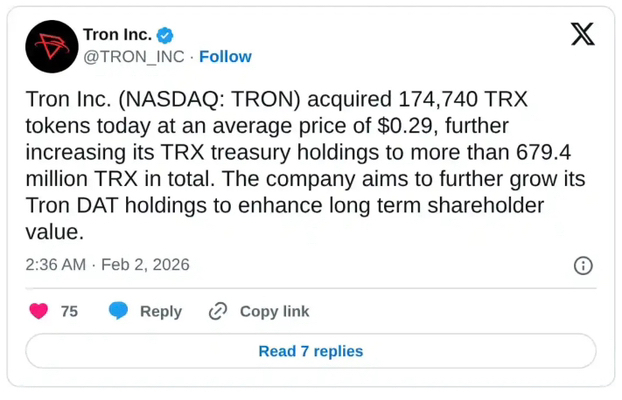 Компания Tron, являющаяся казной цифровых активов (DAT), сосредоточенной на $TRX , приобрела 174,740 токенов TRX в понедельник по средней цене 0.29 долларов, увеличив свои активы до более чем 679 миллионов токенов в общей сложности. Обычно покупка со стороны DAT смягчает давление на настроения розничных инвесторов, но на текущем рынке Tron остается под давлением.