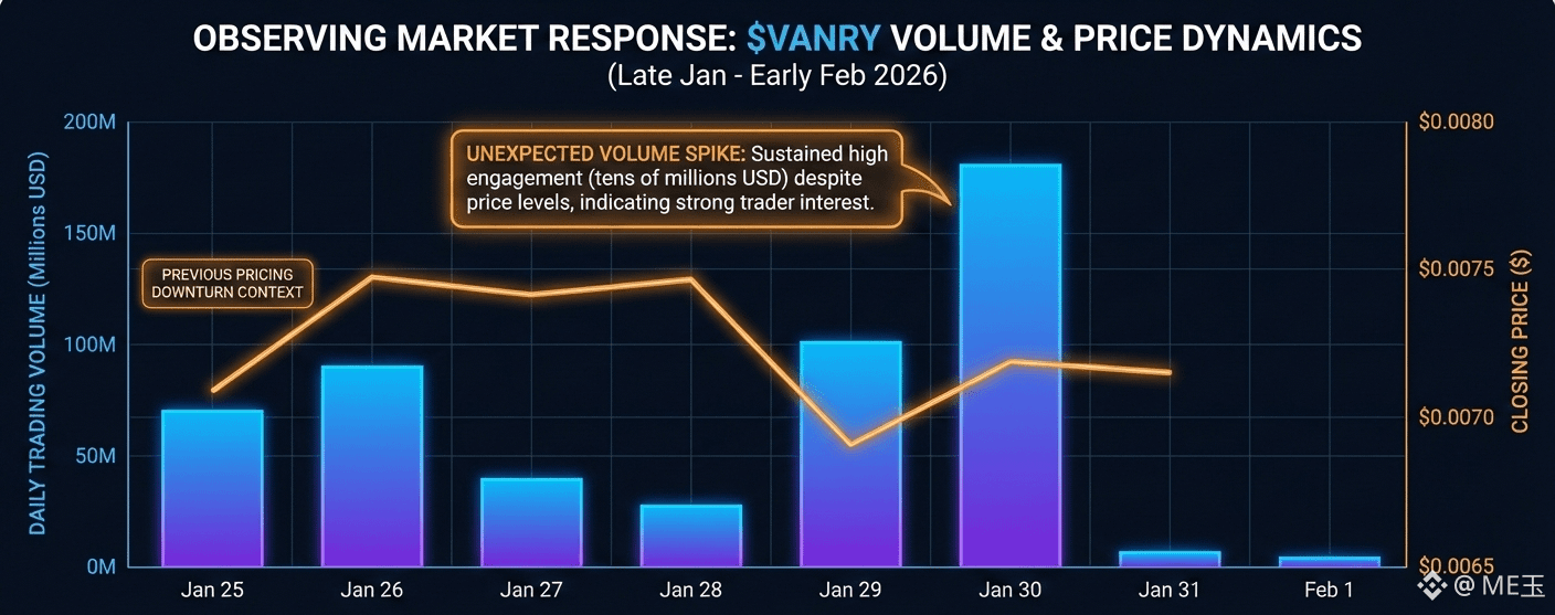 The unexpected spike in daily trading volume over the past week has shown high volumes (e.g. tens of millions of dollars) of traders remain engaged with Vanar despite the previous pricing downturns.