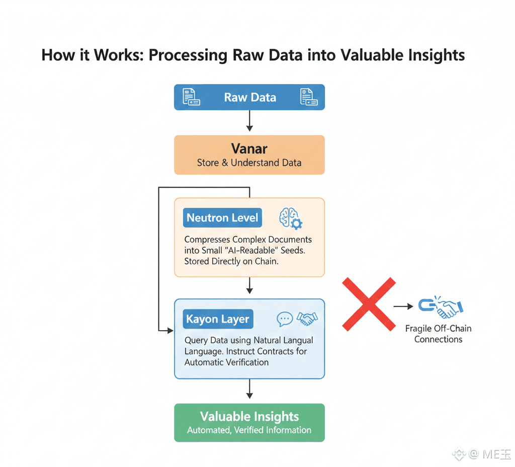 #Vanar has the ability to store and understand data, instead of just storing them. The Neutron Level compresses complex documents such as invoices or deeds into small "AI-readable" seeds, which are stored directly on the chain. The Kayon Layer is where the magic happens. Using natural language, developers can query the data in the Kayon Layer or even use it to instruct contracts to automatically confirm that an invoice meets the terms in a contract. As a result, Fragile Off-Chain Connections are eliminated.