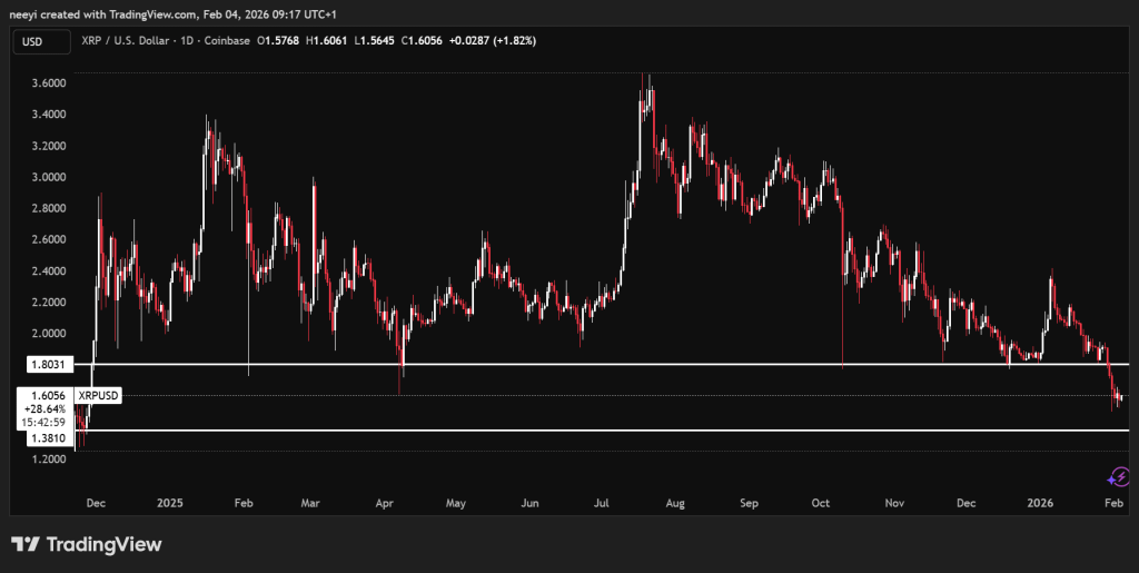 30 января ознаменовал критический поворот. Падение ниже зоны 1,8 $, поддержки, которая удерживалась с 2024 года, увеличило ускорение падения XRP.