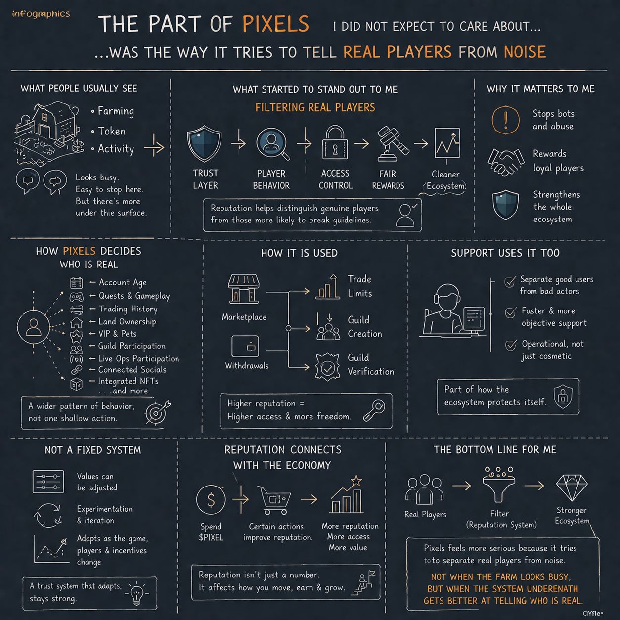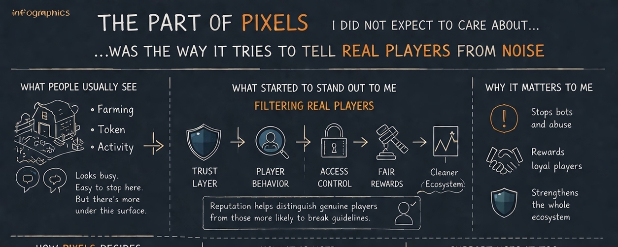 Most people look at Pixels and notice the obvious layer first. The farm. The grinding. The token. The movement. I saw the same thing at first. It is easy to stop there and think you already understand the project. But the more I looked at the official material, the more I felt the more interesting part was sitting under the surface. Not only what players can do, but how the system tries to figure out which players are actually real, committed, and worth trusting.