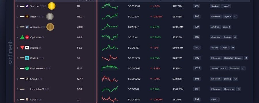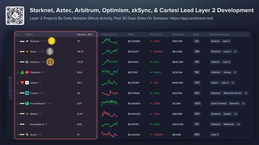 The race for Layer 2 dominance is getting intense, and the latest data from Santiment is turning heads 👀📊. Leading the charge in development activity are Starknet, Aztec, and Arbitrum—three powerhouses shaping the future of scalability and privacy on blockchain networks 💻🔗
