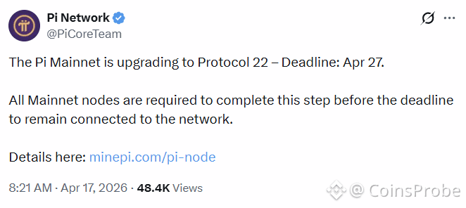 Pi Network has activated the next step in its protocol upgrade sequence — the 21.2 → 22.1 upgrade is now ACTIVE with a deadline of April 27, 2026. The activation marks the fifth consecutive successful protocol migration in Pi Network’s carefully sequenced rollout — and comes with a significantly expanded roadmap that now extends all the way to Protocol 26.0 in June 2026.