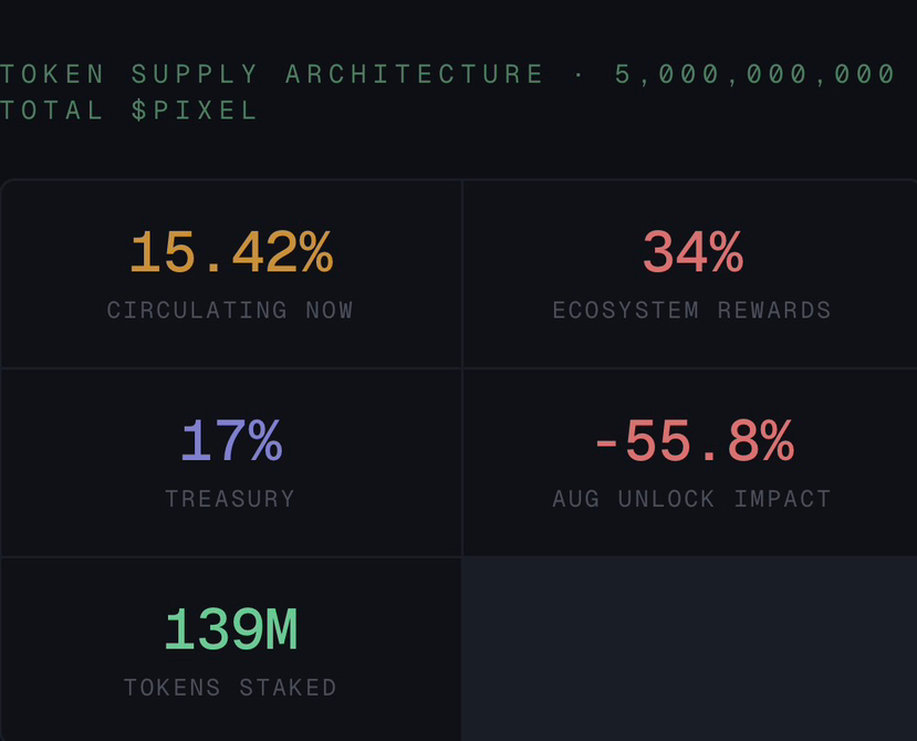 There is a document somewhere — probably a tokenomics page, probably last updated during a market cycle that feels distant now — that describes exactly when the remaining 84.58% of $PIXEL supply will enter circulation. Most people have never read it. Most people who hold the token have never thought to look.