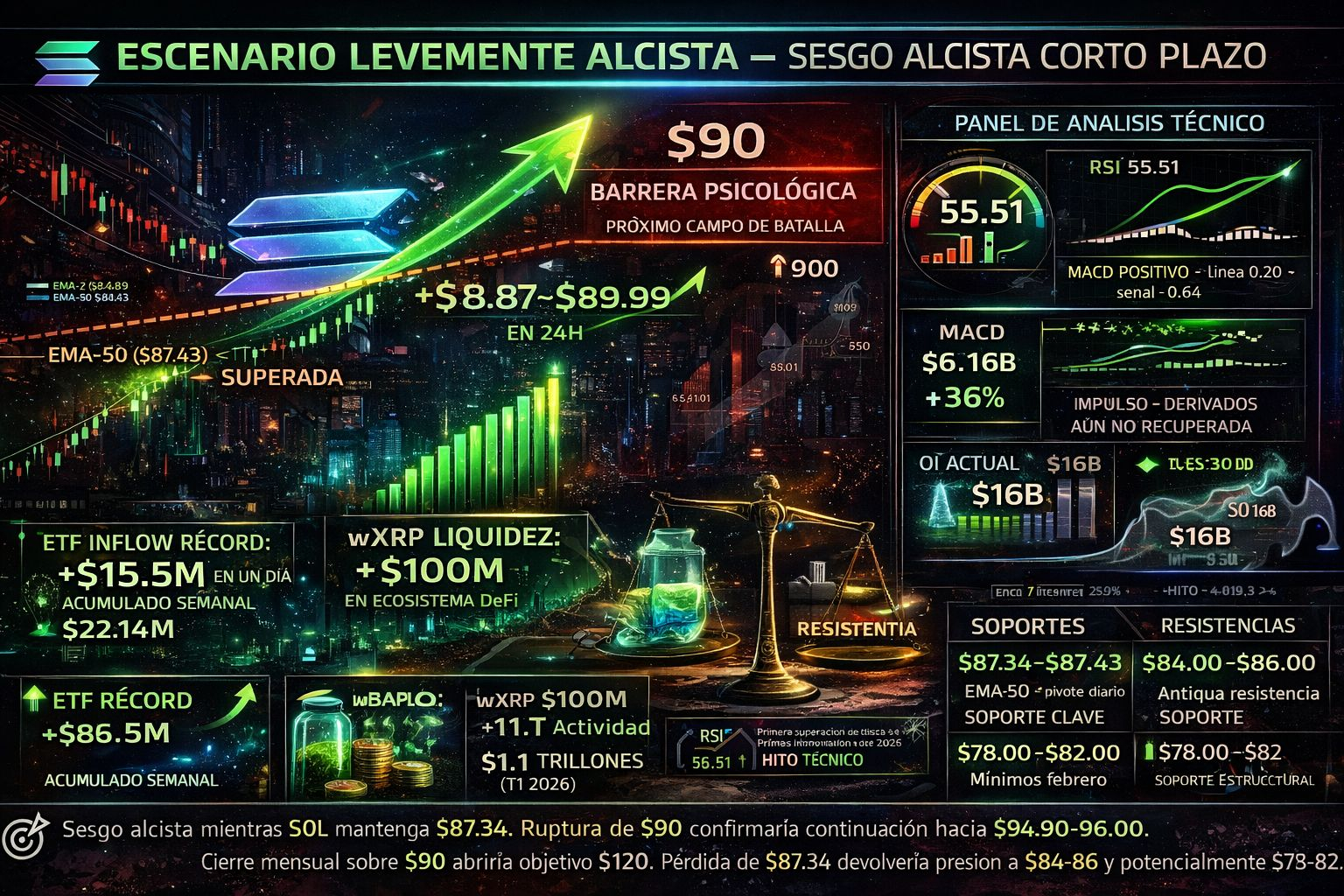 El sesgo es alcista mientras SOL mantenga el soporte de los $87.34. El nivel de $90 es el próximo campo de batalla: una ruptura sostenida por encima de este nivel confirmaría la continuación hacia $94.90-96.00 en el corto plazo. Un cierre mensual por encima de $90 podría abrir la puerta a objetivos de $120 en el mediano plazo. Por el contrario, una pérdida de los $87.34 devolvería la presión bajista hacia la zona de $84.00-86.00 y potencialmente $78.00-82.00.