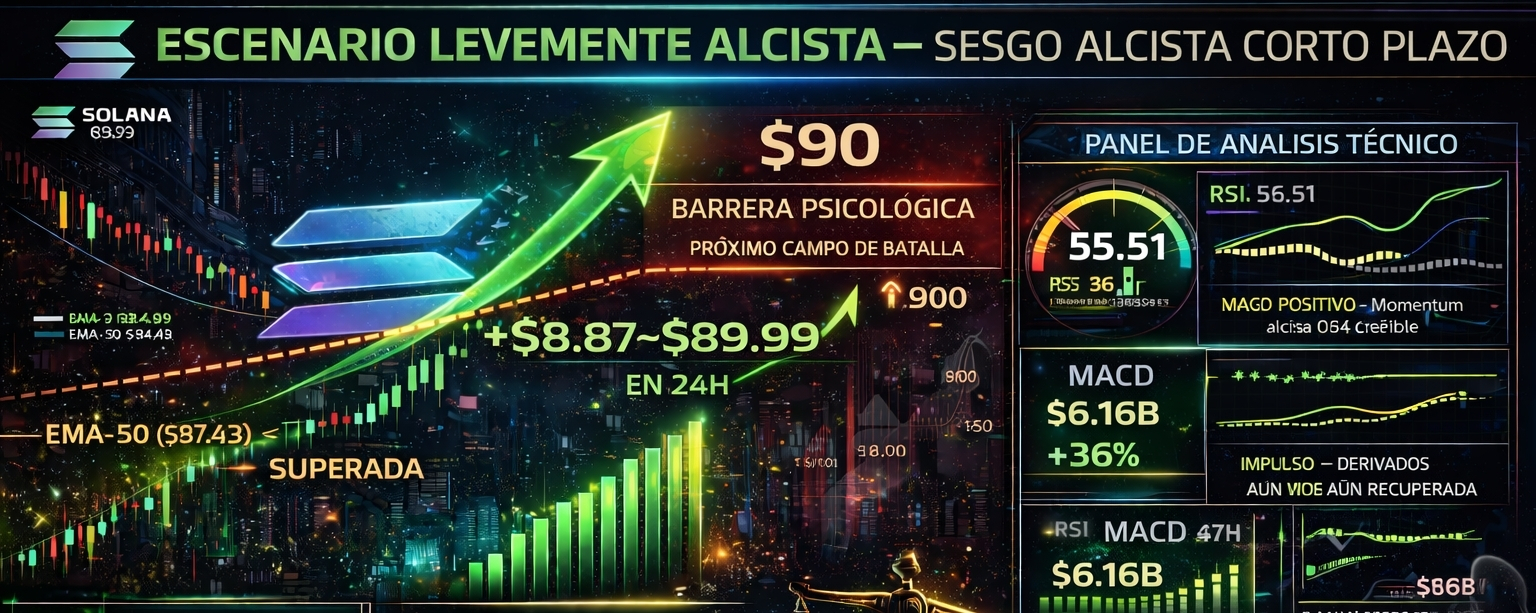 $SOL cotiza alrededor de los $88.87 - $89.99 al cierre del jueves, registrando un aumento del +3.84% - 5.3% en las últimas 24 horas. El activo ha superado la EMA-50 ($87.43) y ahora se enfrenta a la resistencia crítica de los $90, un nivel psicológico clave que definirá el próximo movimiento.