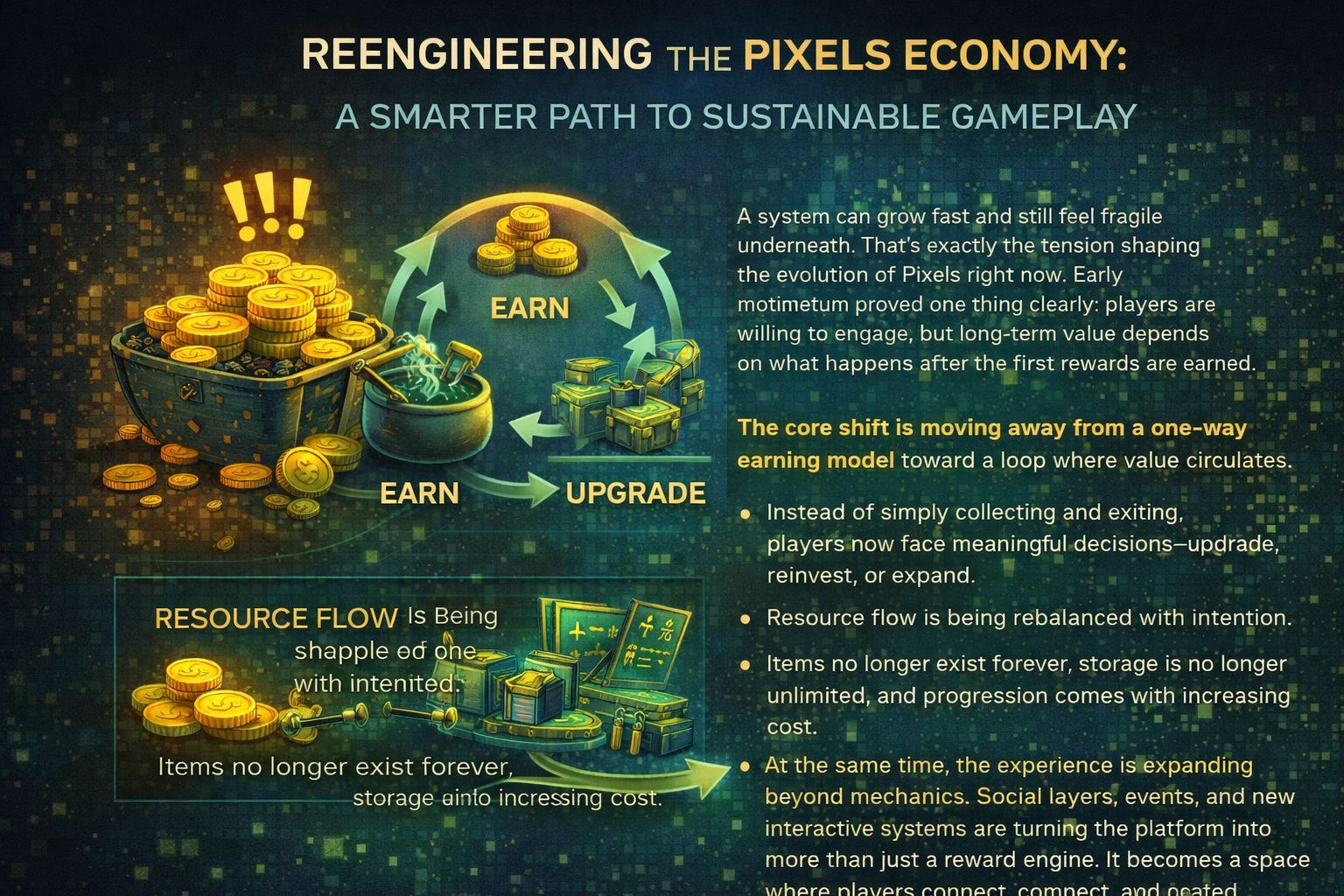At its peak, Core Pixels revealed two major weaknesses that couldn’t be ignored. First, the in-game economy had an incomplete loop. Players were earning resources and coins, but there weren’t enough meaningful ways to spend them. This created inflation pressure, where value kept circulating without being absorbed. Second, the late-game experience felt shallow. Once players reached a certain point, there wasn’t enough depth to keep them engaged, leading many to extract value instead of reinvesting time or effort back into the ecosystem.