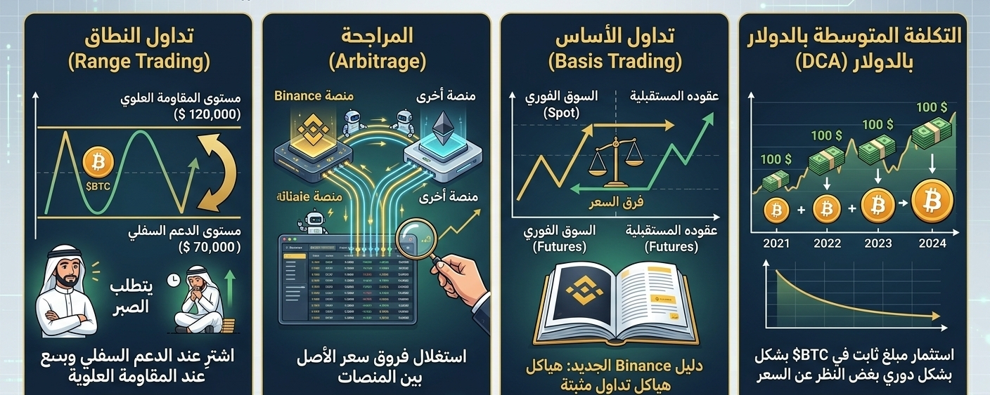 · المراجحة (Arbitrage): استراتيجية شبه خالية من المخاطر تعتمد على استغلال فروق سعر الأصل نفسه بين منصات مختلفة (مثل Binance ومنصة أخرى). في 2026، أصبحت تتطلب أدوات أتمتة متطورة وبوتات متخصصة لالتقاط الفروقات الضئيلة بسرعة.
