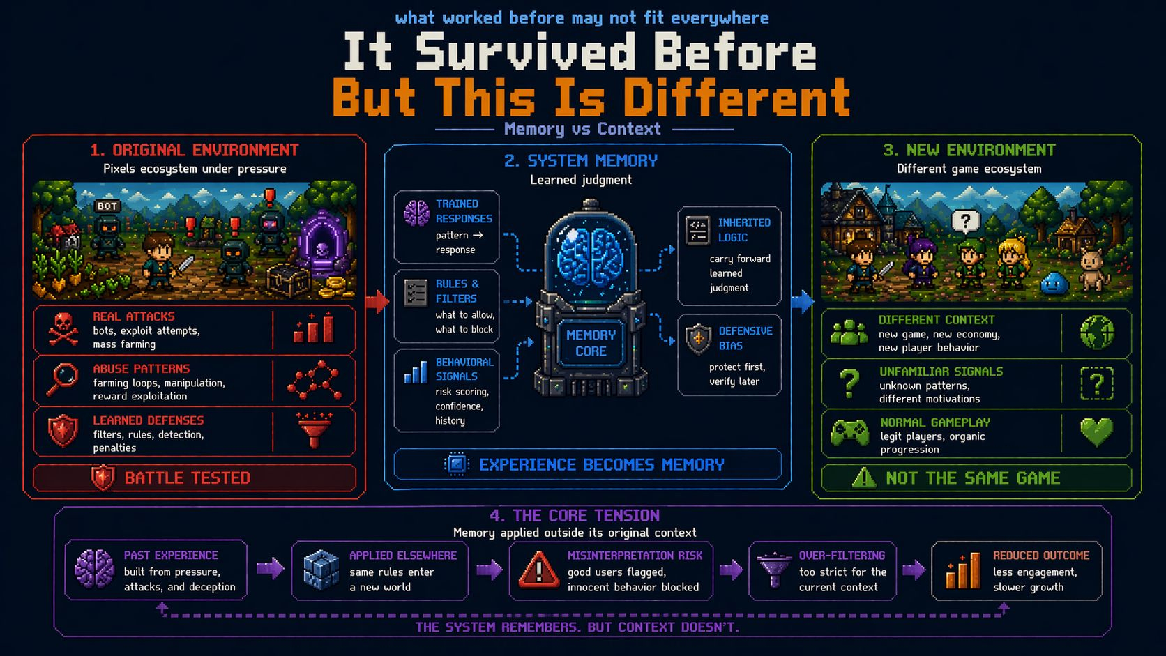 That’s why I think the real question isn’t whether Pixels has learned the right lessons. It probably has. The question is whether those lessons can adapt when they leave home. Whether the system can tell the difference between patterns that deserve skepticism and patterns that just look unfamiliar.