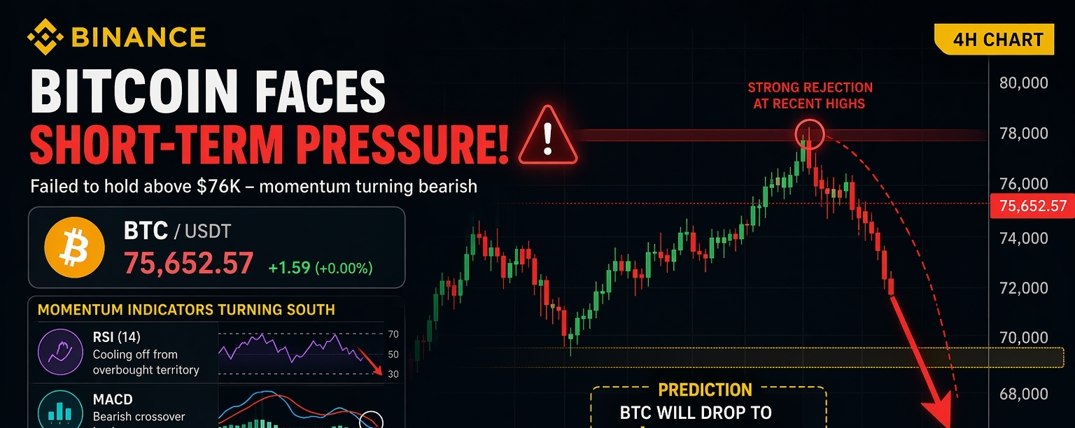 The crypto market is flashing caution signals as $BTC Bitcoin (BTC) struggles to maintain its recent bullish momentum. After failing to hold above the critical $76,000 resistance zone, BTC is now showing signs of short-term weakness—raising concerns among traders about a potential pullback.