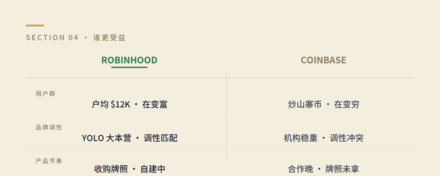 虽然 Cantor 和 Bernstein 的报告把两家一起点名,但迪总的判断是:Robinhood 比 Coinbase 更受益。