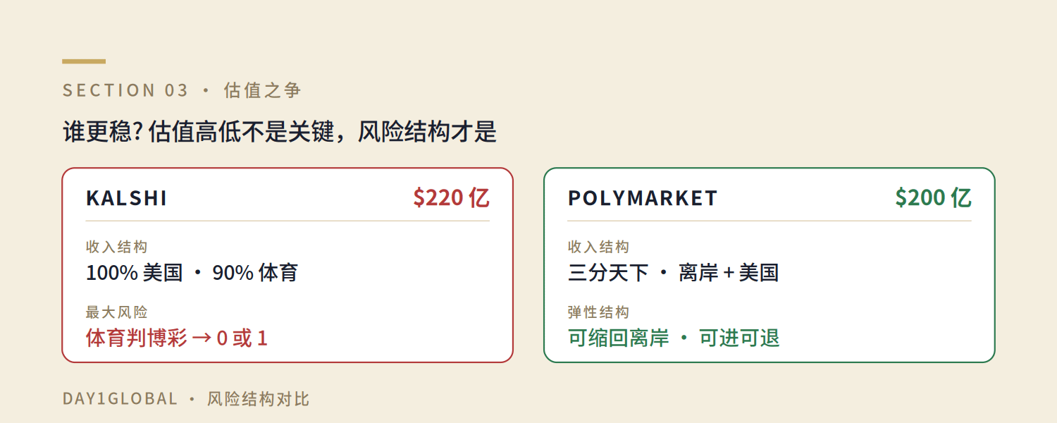 💡 看点:估值高低不是关键,风险结构才是。Kalshi 是一把双刃剑——赢则猛涨,输则归零;Polymarket 是带保险的多元仓位。