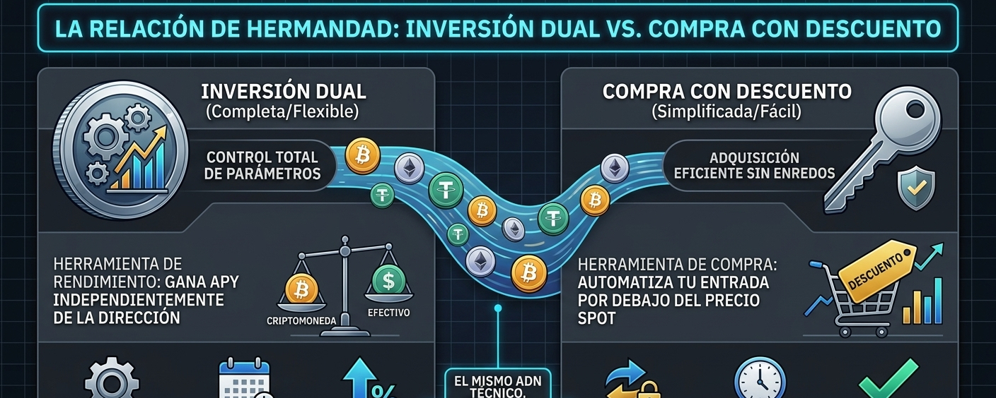 Para un inversor profesional, entender que estas herramientas son "hermanas" es clave para no dejarse confundir por el marketing. Si buscas un control total sobre los parámetros, la fecha exacta y el retorno de inversión, la Inversión Dual es tu terreno; pero si lo que buscas es una forma rápida, directa y sin complicaciones de hacer que tu dinero trabaje mientras esperas una corrección de precio, la Compra con Descuento es la solución ideal. Al final del día, lo importante no es solo la herramienta, sino la capacidad de utilizar estos productos para asegurar que nuestra liquidez nunca esté estática, convirtiendo cada escenario del mercado en una oportunidad de compra eficiente.