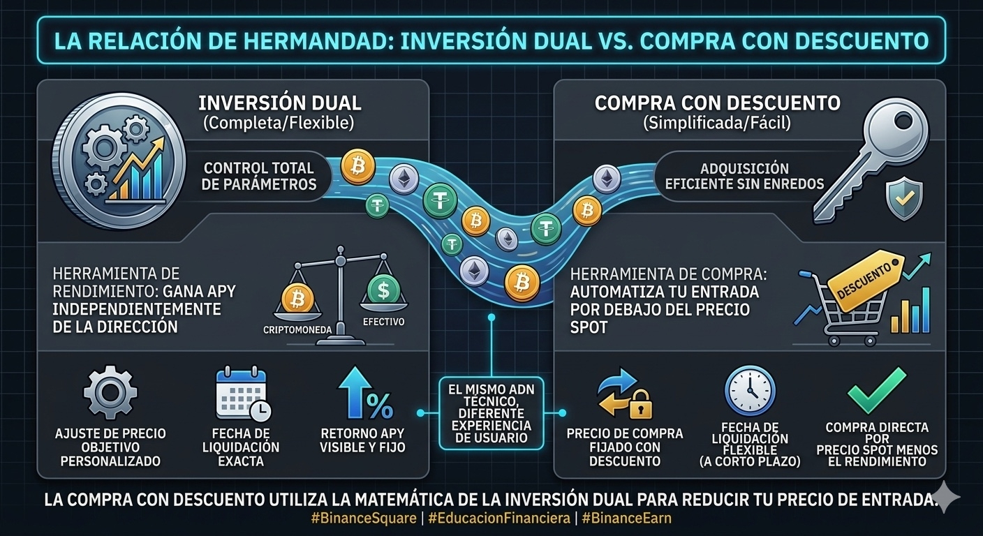 La estrategia de fondo en ambos productos es la misma: estamos aceptando el compromiso de comprar un activo a un precio determinado en el futuro a cambio de un beneficio. En la Inversión Dual, ese beneficio se visualiza como un rendimiento porcentual (APY) que recibes por tu paciencia, mientras que en la Compra con Descuento ese rendimiento se utiliza matemáticamente para reducir el precio final que pagas por la criptomoneda. Básicamente, Binance ha tomado la potencia de los derivados de la Inversión Dual y la ha transformado en una experiencia de usuario fluida donde el foco principal es simplemente adquirir el activo más barato que en el mercado Spot.