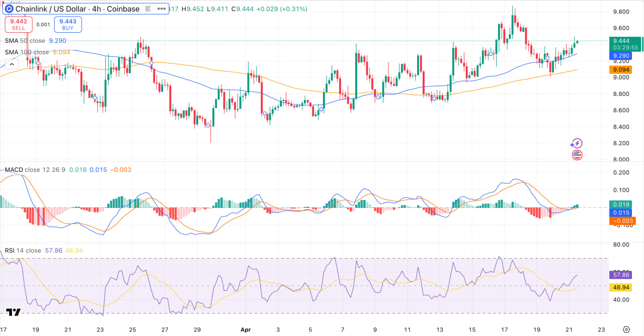 Technical Picture (4H): LINK trades near $9.44, above SMA 50 ($9.29) and SMA 100 ($9.09). RSI at 57.86 is moderately bullish. The MACD line ($0.018) sits above the signal line ($0.015), though the histogram is slightly negative (-0.003), suggesting a brief pause in momentum rather than a reversal. Key support sits between $9.09 and $9.20.