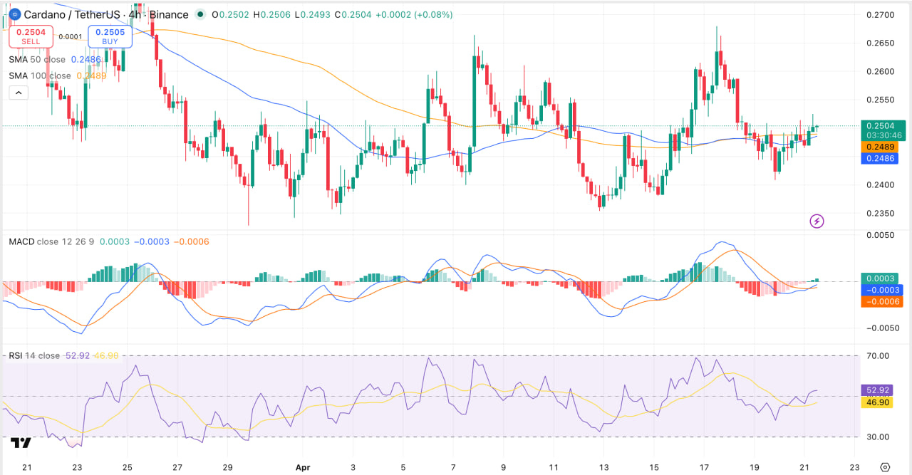 Technical Picture (4H): ADA is trading around $0.2504, clustered tightly with SMA 50 ($0.2486) and SMA 100 ($0.2489) - all three compressed together, which typically precedes a directional move. RSI at 52.92 is neutral. The MACD line (0.0003) has crossed above the signal line (-0.0003) but the histogram remains near zero. A confirmed move above $0.255 would open room toward $0.27.