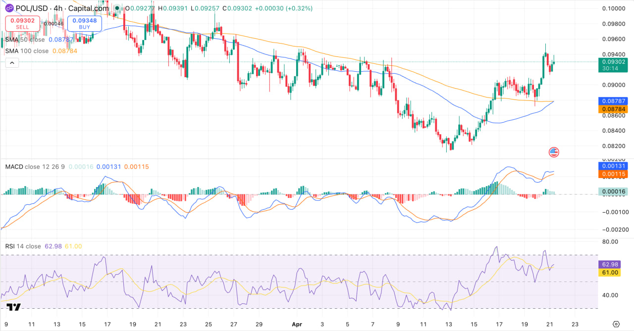 Technical Picture (4H): POL is trading around $0.093, above both SMA 50 ($0.08787) and SMA 100 ($0.08784). RSI sits at 62.98, signaling strong momentum without clear overbought conditions. The MACD line ($0.00131) is above the signal line ($0.00115) and the structure is bullish. A confirmed break above $0.094-$0.096 would be the next meaningful confirmation level.