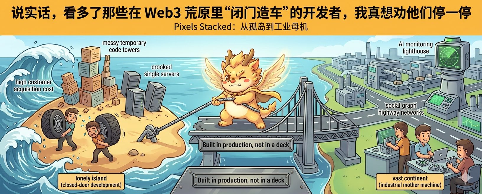 以前开发者想做个 Web3 游戏,就像在荒野里徒手造轮子。而现在接入 Stacked,就像是接入了成熟的水电煤。Pixels 把过去几年踩过的坑、反作弊的经验、高留存的逻辑全部模块化了。你不需要再去操心怎么防黑产薅羊毛,因为 Stacked 已经用那 2 亿次分发的经验替你试错过所有风险。