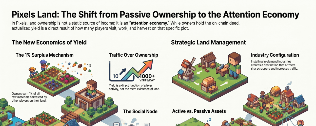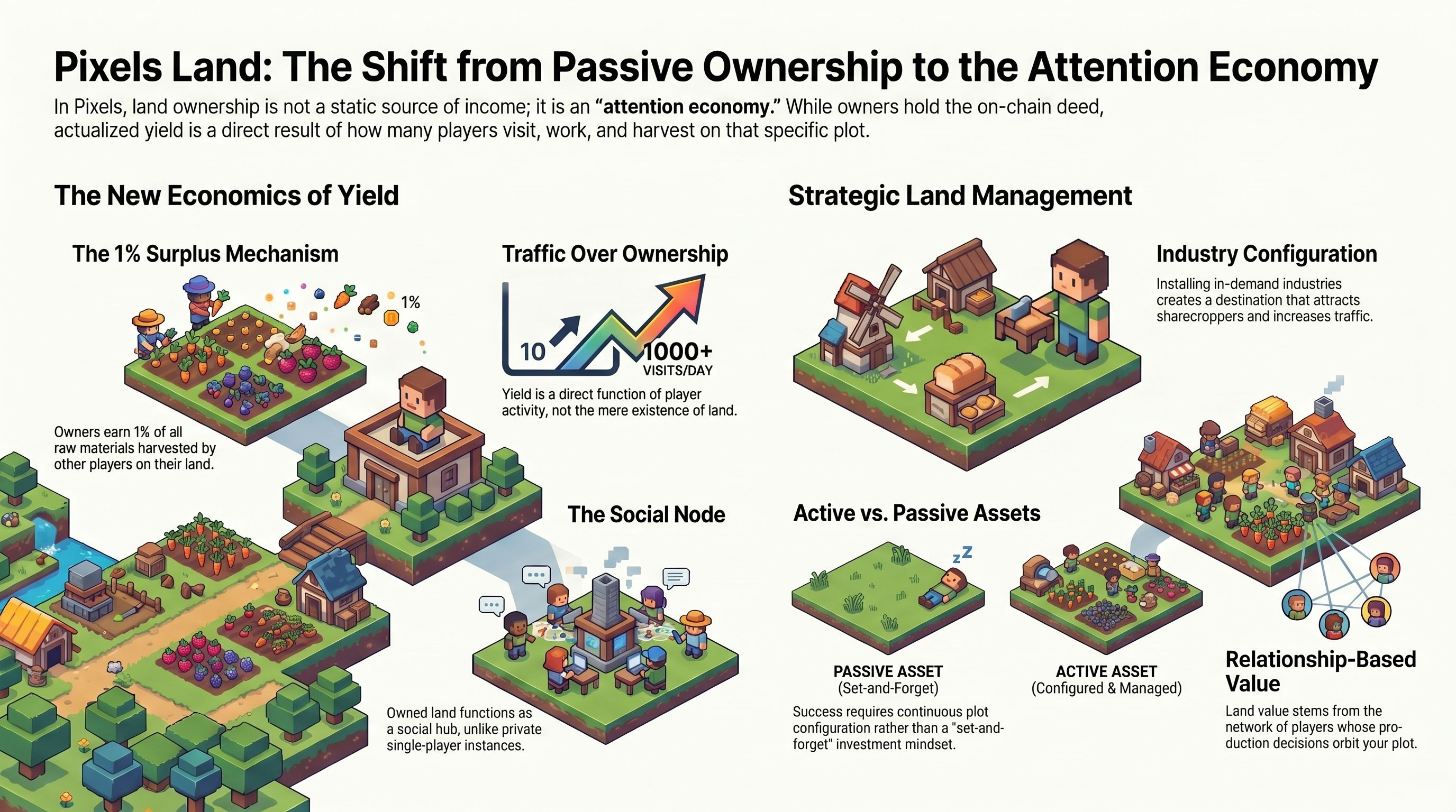 because here's what I keep coming back to. a land plot sitting idle in a wallet with no active industries and no visiting players earns its owner nothing beyond the staking power boost. the on-chain asset is real. the potential yield is real. but the actualized yield is a direct function of whether other players find that land worth visiting and working. which means the land economy in Pixels is not really an asset economy. it is an attention economy. the landowners who win are not necessarily the ones with the most land. they are the ones who have configured their land to be most useful to the players who might visit it.