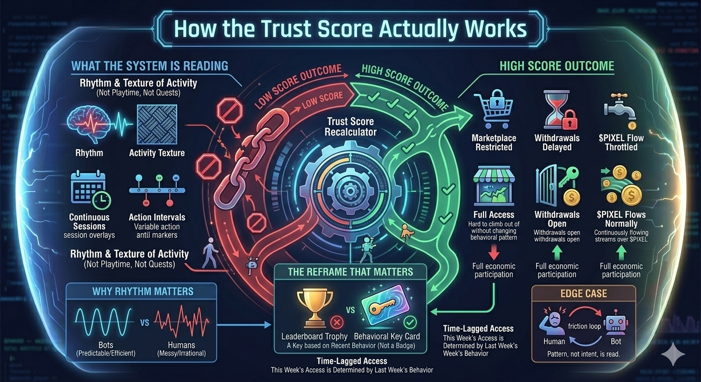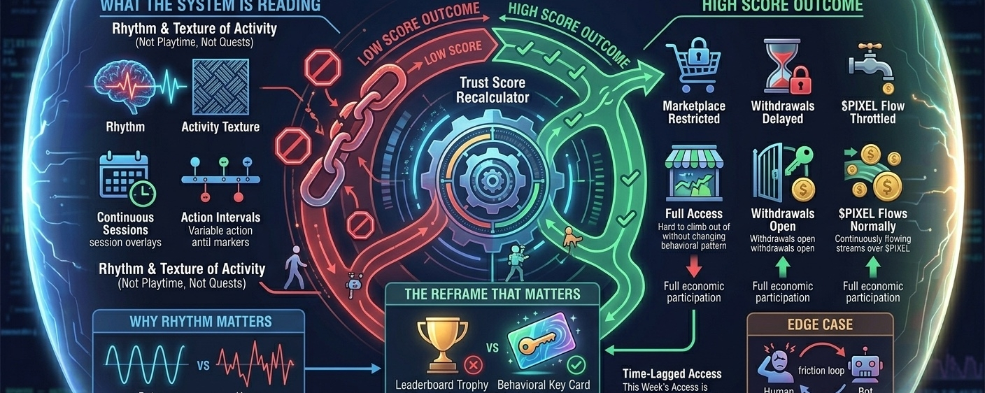 low trust score means the economic doors stay partially closed. marketplace restrictions, withdrawal delays, throttled $PIXEL access, higher friction across the board. high trust score means the full economic stack opens. it sounds like a simple tier system but the architectural decision underneath is significant