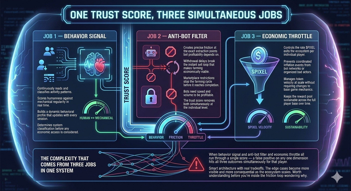 it’s a behavior signal — continuously reading and classifying your activity pattern against a model of what human versus mechanical engagement looks like. it’s an anti-bot filter — creating precise friction at the exact points where bot extraction depends on speed and volume, withdrawal delays that break the instant sell loop, marketplace restrictions that stop the farming cycle before completion. and it’s an economic throttle — controlling the rate at which $PIXEL exits the ecosystem at the individual level, preventing coordinated inflation events, managing token velocity without touching the base game mechanics