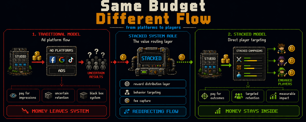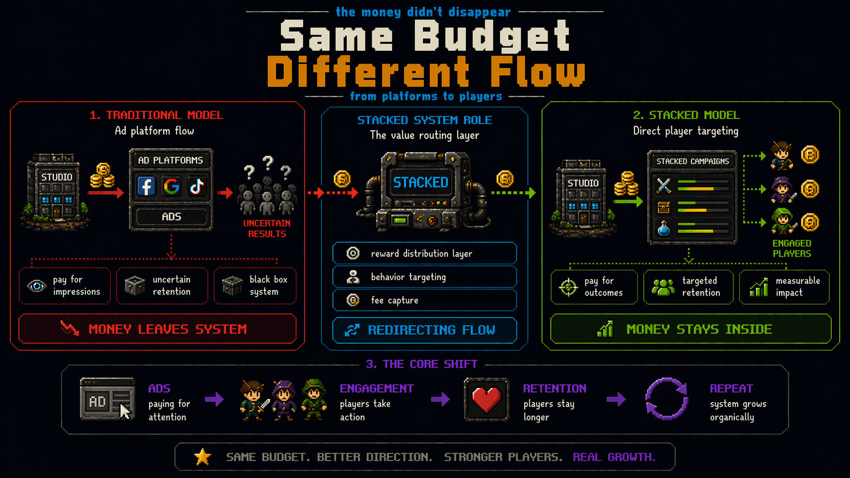 Stacked isn’t just adding another layer of quests or incentives. It’s sitting in the middle of a massive flow of money that already exists in gaming, the user acquisition budget, and rerouting it. Instead of paying for impressions and hoping some users stick, studios are effectively paying for outcomes. And Stacked takes a cut from that flow.
