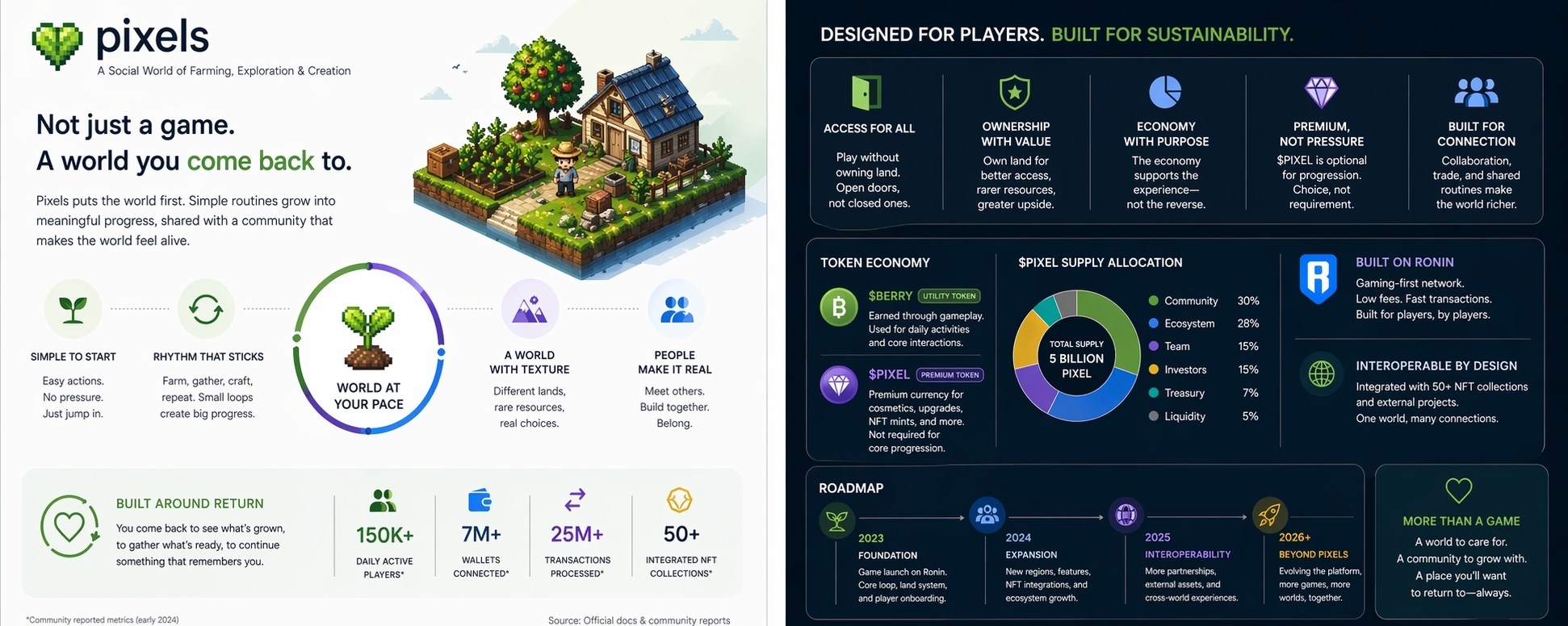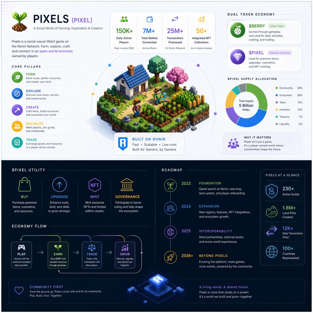 There is something quietly comforting about a game that asks you to begin with simple things. Planting crops. Gathering materials. Walking through open space. Meeting people who are doing the same. Pixels is built on those ordinary motions, and that is part of its strength. It does not rush to overwhelm you with complexity. It lets the world introduce itself gradually, almost the way a real place does. You learn by staying. You understand it by returning. That kind of design can seem modest from the outside, but it creates a stronger connection than louder games often manage. People do not always remember the biggest experience. They remember the one that felt lived in.