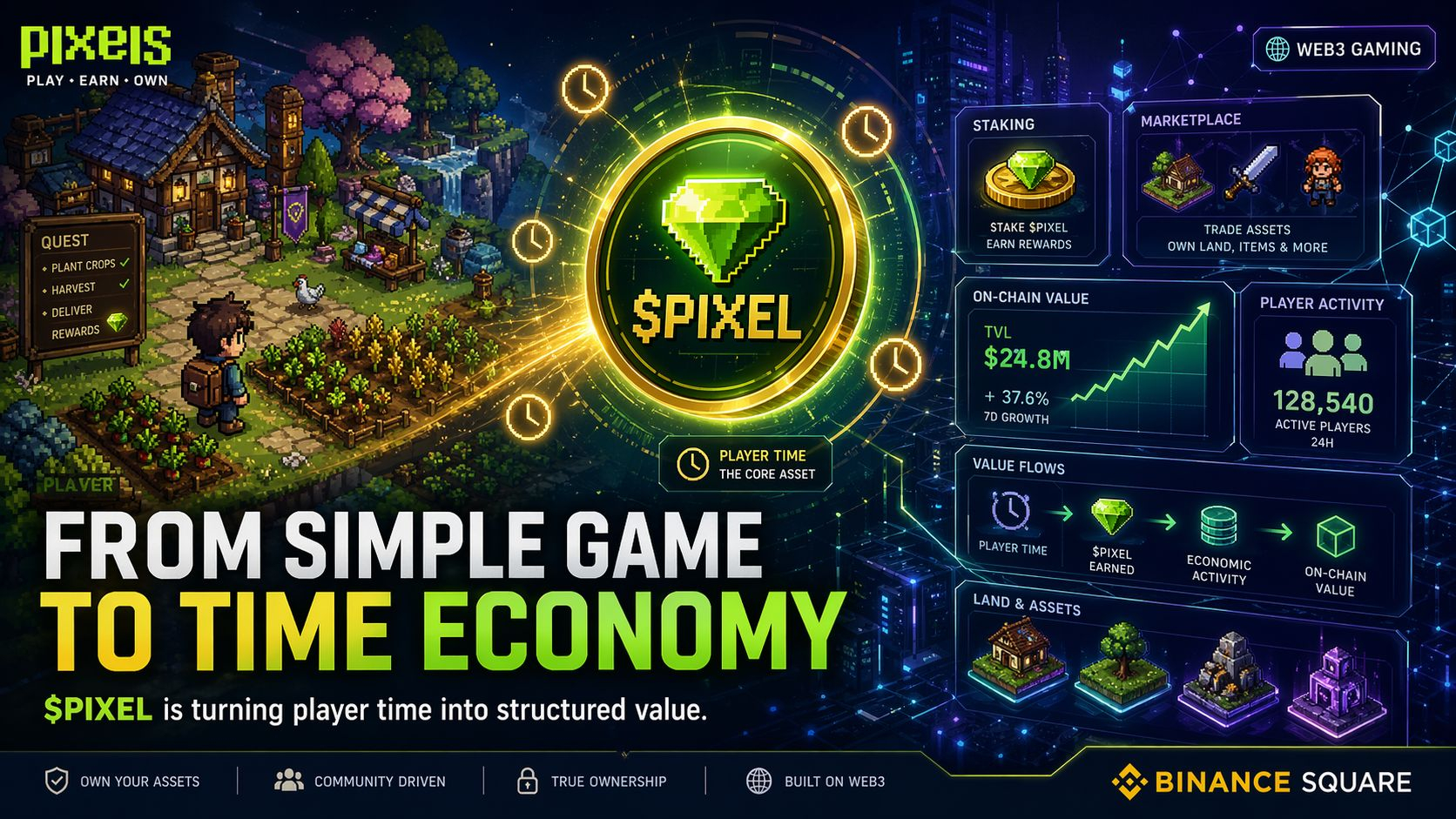 What makes Pixels interesting is not the fact that it looks simple. In truth, that is probably part of why so many people underestimate it. On the surface, it feels familiar: a light farming game, easy to enter, easy to understand, and easy to dismiss. But when you stay with it a little longer, a different picture starts to appear. What looks like a casual onchain game is gradually behaving more like a live digital economy where time itself is being organized, filtered, and valued through the logic of $PIXEL. That shift matters, because in Web3 gaming the biggest question has never been whether people can earn. The real question is whether a game can create a system where the time people spend inside it becomes meaningful without turning the whole experience into extraction.