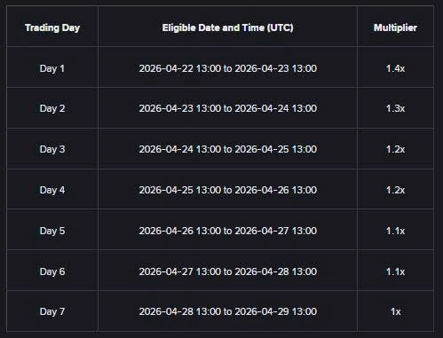 Example: If a user trades $10,000 worth of eligible token on Day 1, the effective trading volume counted toward the ranking will be $14,000. The same $10,000 traded on Day 7 would only count as $10,000.