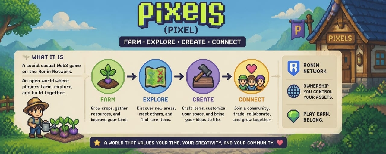 Pixels (PIXEL) is the kind of thing I would usually move past without thinking too much about it. Not because it’s doing anything wrong, just because it looks familiar in a space that repeats itself a lot. A soft open world, farming, people building things, walking around, spending time. I’ve seen enough versions of that to know how quickly they blur together.