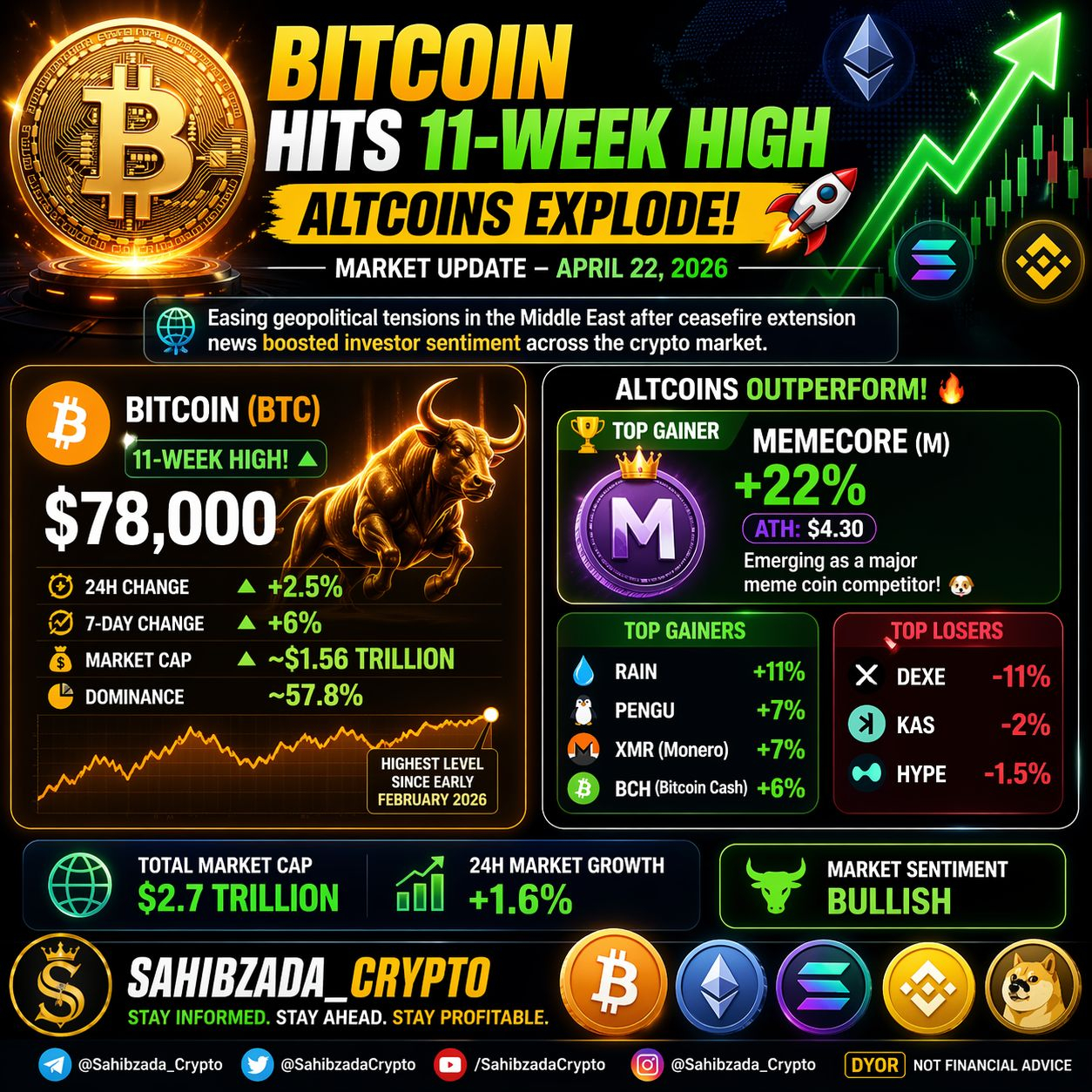 Bitcoin ₿ surged past $78,000, reaching its highest level since early February 2026. The move came after easing geopolitical tensions following statements from Donald Trump.