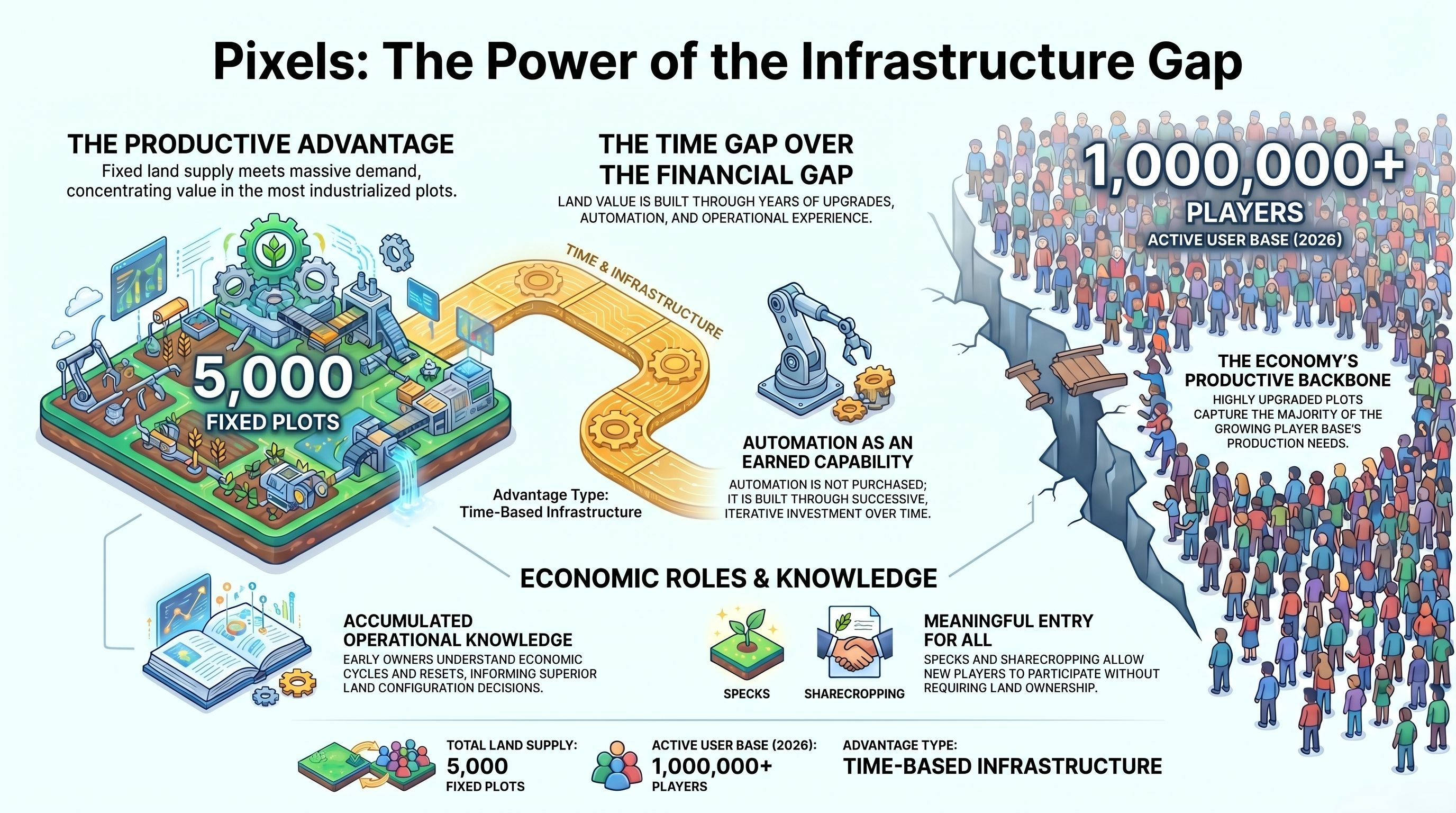 as the active player base grows, the demand pressure on land-based production does not distribute itself evenly across all 5,000 plots. it concentrates on the plots that are most industrialized, most upgraded, most configured for high-throughput output. a land owner who spent four years activating industries and upgrading production capacity is not just ahead of a new entrant on a linear scale. they are operating at a point on the upgrade curve that a new land purchaser in 2026 would need years of continued investment to reach, regardless of how much PIXEL they are willing to spend at the current moment.