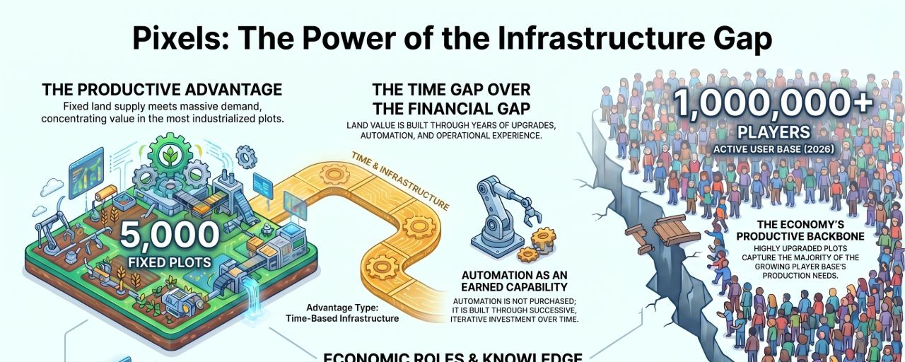 the question is not whether new participants can find value in Pixels. they clearly can. the question is whether the players entering the ecosystem in 2026 understand that the economy they are joining has been shaped by four years of infrastructure decisions made by participants who are not visible in the leaderboard but whose upgraded plots, automated industries, and accumulated skill levels form the productive backbone of everything the growing player base is now interacting with.