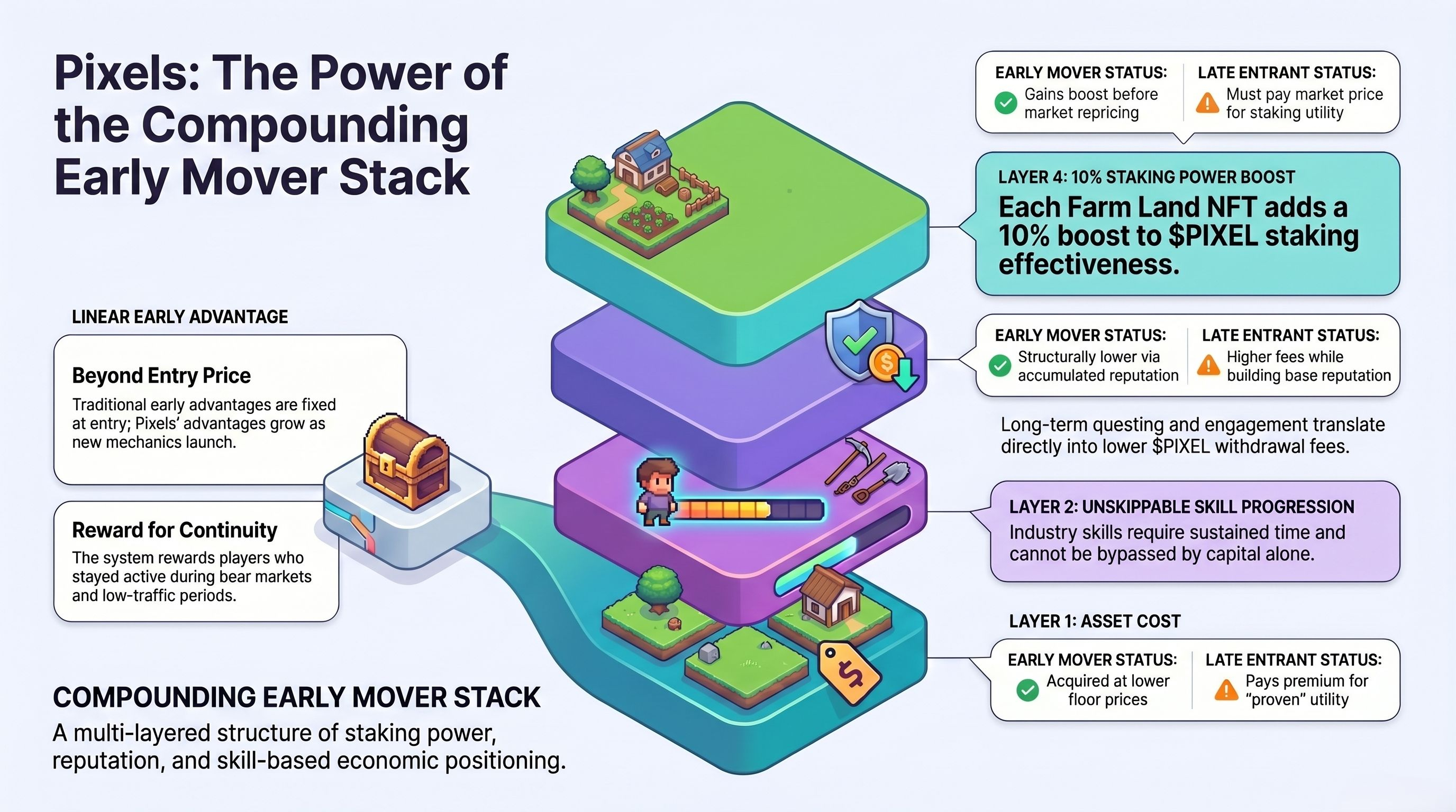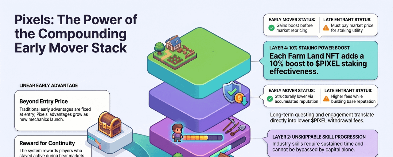 because here's what I keep coming back to. in most token economies, early mover advantage is linear. you bought at X, price went to 10X, your gain is fixed. time does not add new layers after the initial price movement. but in Pixels, the advantage structure keeps accumulating as the ecosystem develops new mechanics. the player who held land NFTs through the bear market not only preserved the staking power boost those NFTs now provide. they also accumulated the reputation score that comes from sustained in-game activity during the period when most players had left. they leveled skills through industry continuity that later entrants have to rebuild from zero. they established production relationships with other landowners and sharecroppers before new players arrived to compete for the same industries.