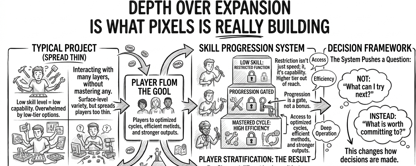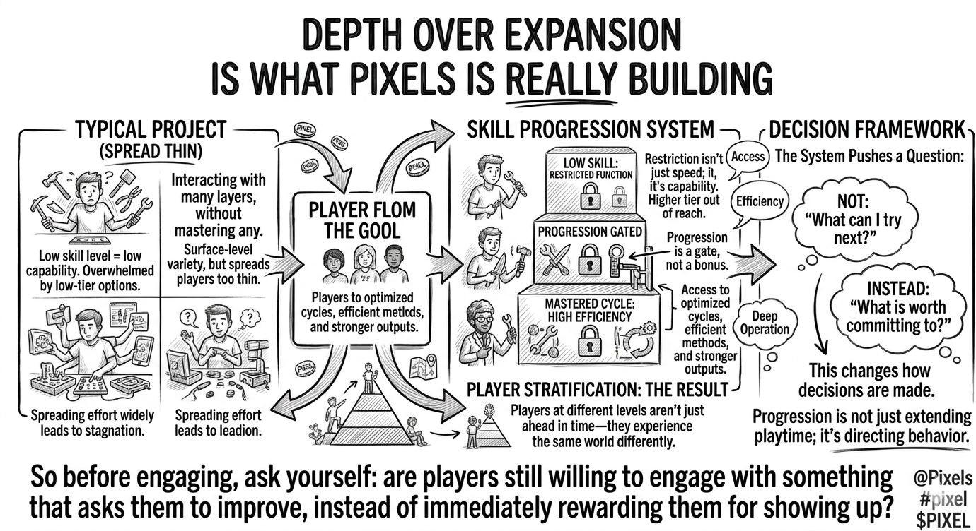 many systems lose depth by allowing players to move too quickly across layers. Pixels does the opposite. it places progression as a gate, not a bonus, ensuring that moving forward requires actual capability, not just presence.
