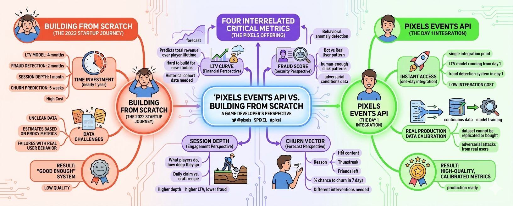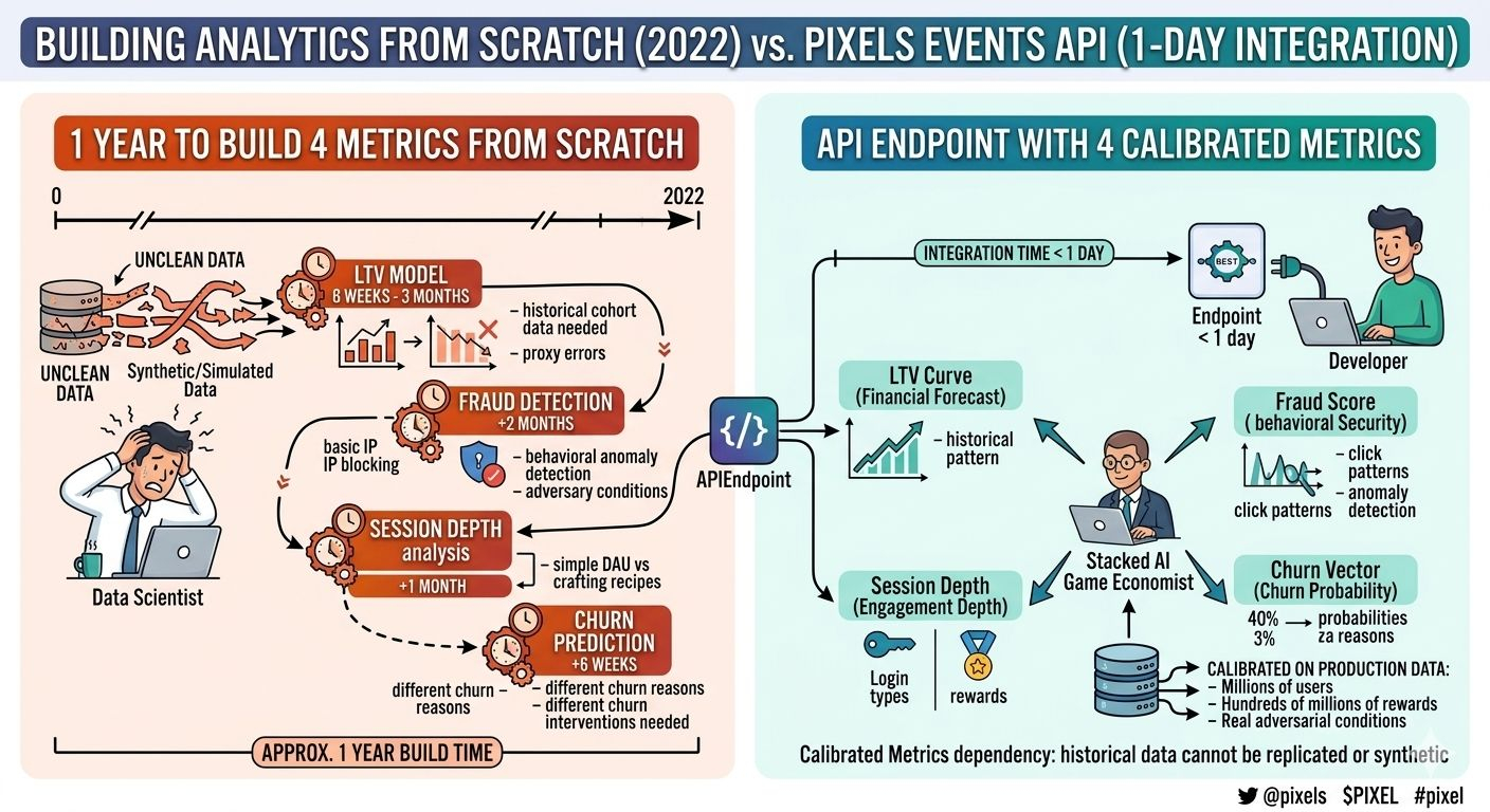 Tổng cộng gần một năm để có bốn metric mà bây giờ Pixels offer qua một REST endpoint với integration time dưới một ngày.