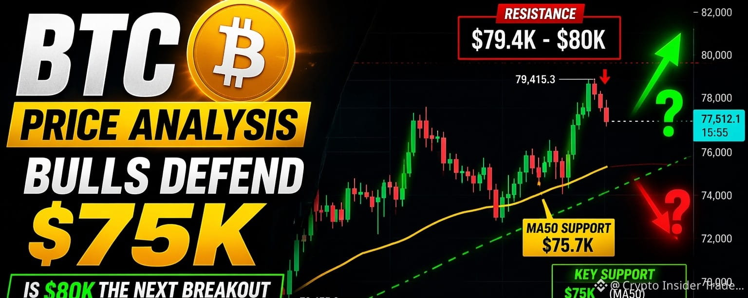 ➤ Bitcoin is once again sitting at a critical psychological and technical zone, hovering around $77.5K after tapping highs near $79.4K.