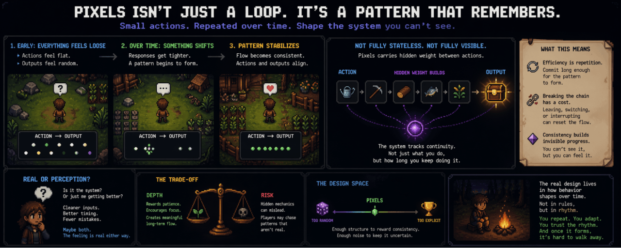 If Pixels is designed this way then it sits somewhere between a stateless loop and a persistent system.