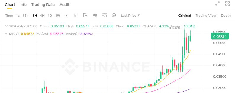 На момент написания цена 0.05311 USDT (+77% за 24ч), объёмы торгов взлетели в разы. RSI (24ч) на уровне 93.92 — глубокий overbought. Это классический сигнал сильного импульса, но и высокой вероятности коррекции: рынок перегрет, фиксация прибыли может начаться в любой момент.