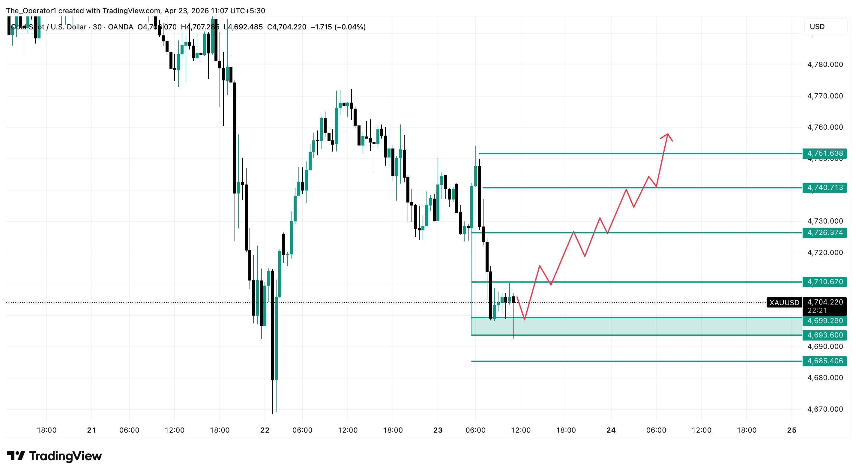 Similarly, if you mark the high of 21st April and the low of 22nd April, Wednesday’s swing high around $4773 also aligns with the 0.618 level, from where the market reversed again.