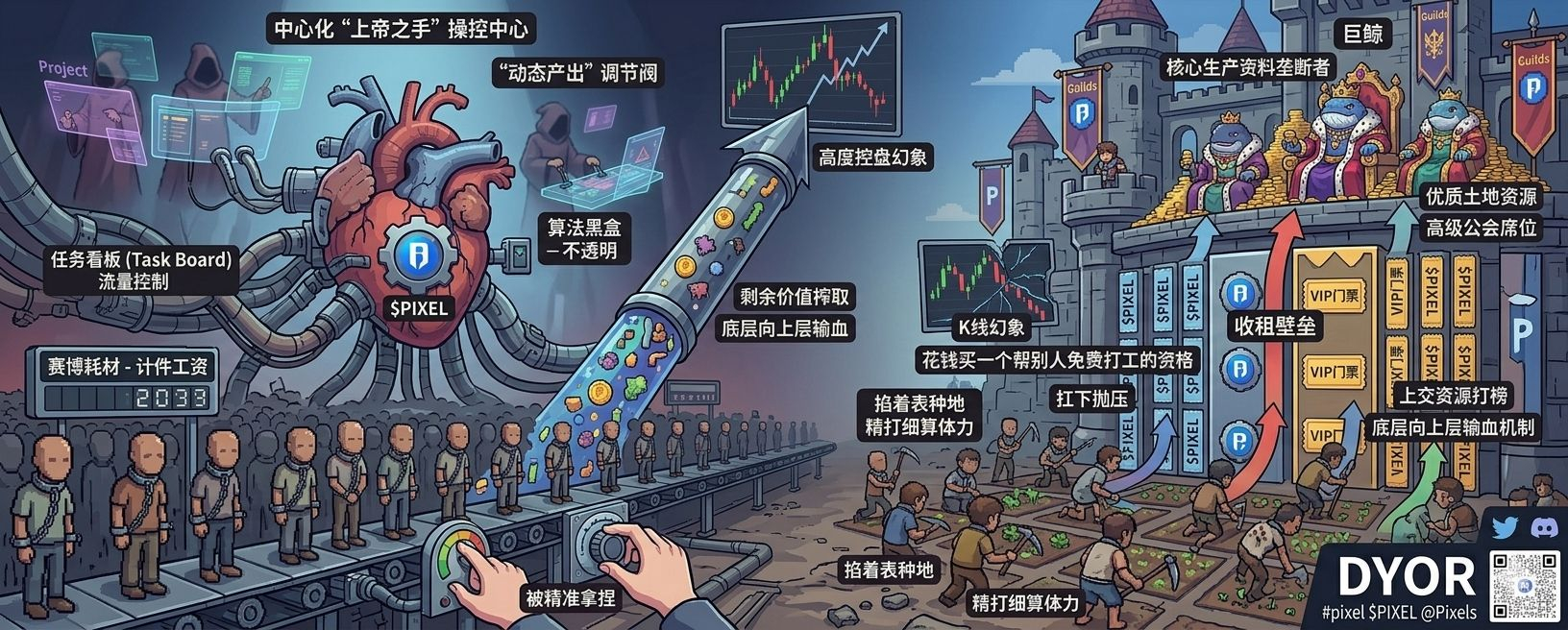 但我更想撕开这层“温情脉脉”的种田伪装,直视其底层极其冷酷的权力结构。当我们都在为 Pixels 所谓“健康的代币消耗”和“极高的用户粘性”欢呼时,有没有人真正冷静下来想过:这种依靠中心化“上帝之手”强行捏造出的经济平衡,到底是一场真正意义上的去中心化革命,还是彻头彻尾的算法独裁?