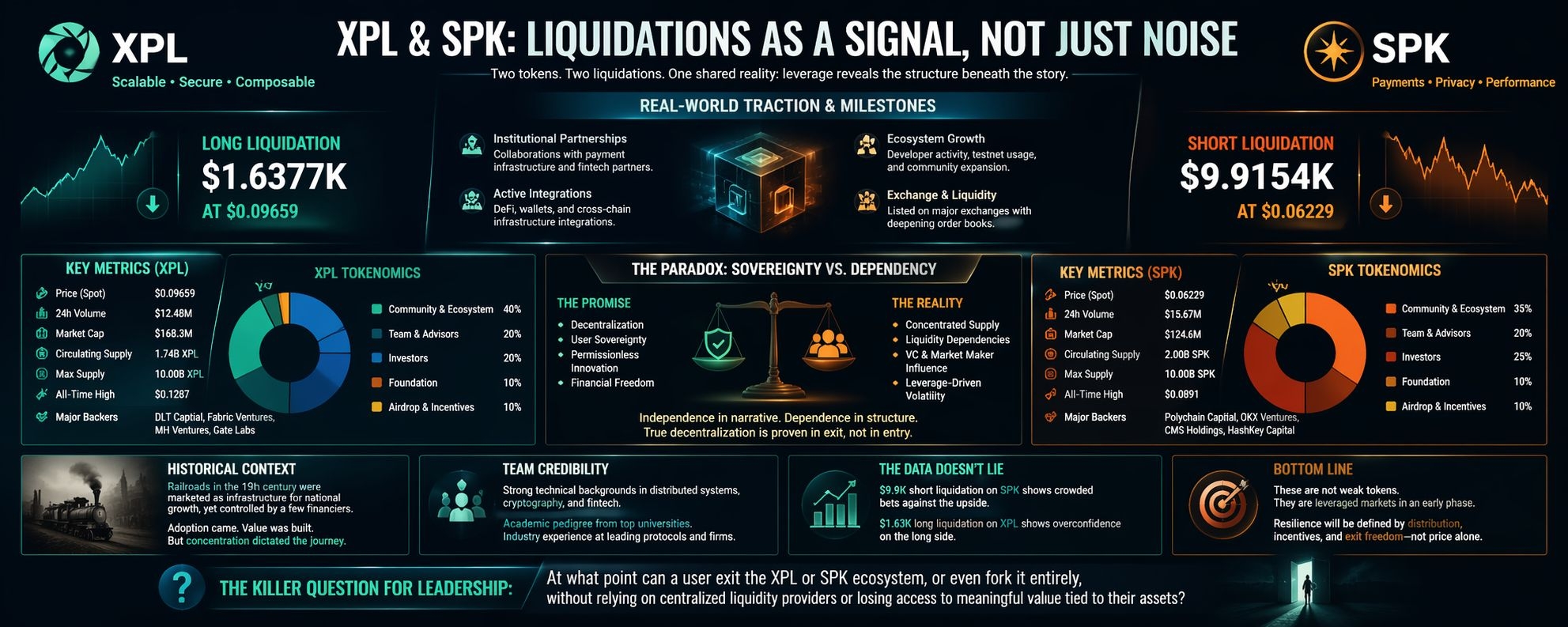 A $9.9K short liquidation on $SPK at $0.06229 and a $1.63K long wipeout on XPL at $0.09659 might seem like routine derivatives activity. But step back, and they signal something more important: both ecosystems have reached a level of participation where leverage actually matters. Markets don’t liquidate what they ignore.