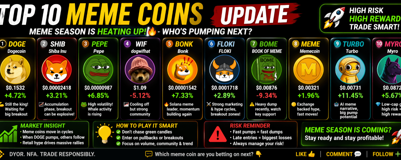 🚨 TOP 10 MEME COINS UPDATE — WHO’S PUMPING NOW? 🚨