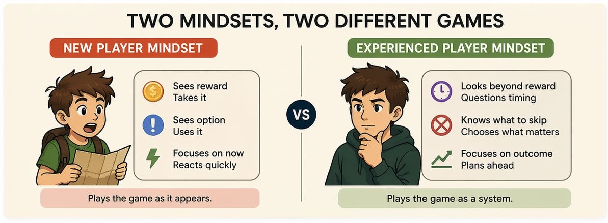 New players usually move on instinct. If something is available, they take it. If something pays, they repeat it. Their focus is on what’s happening right now.